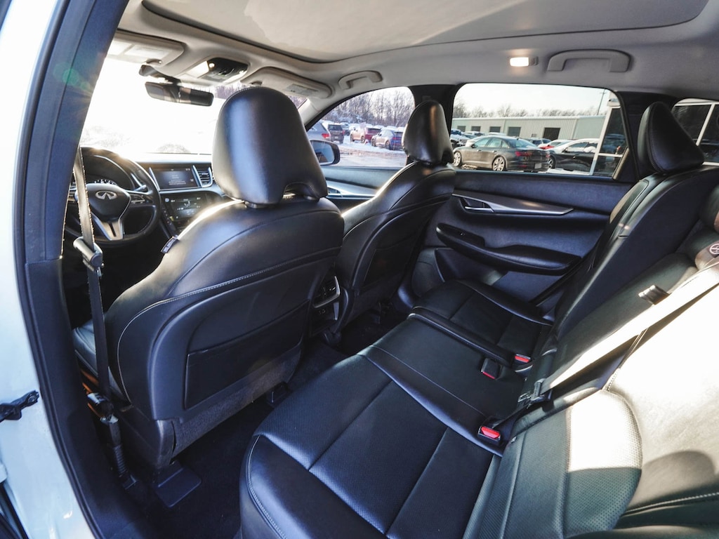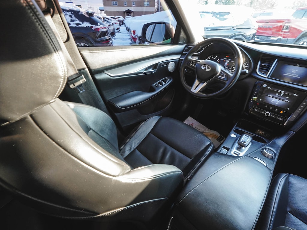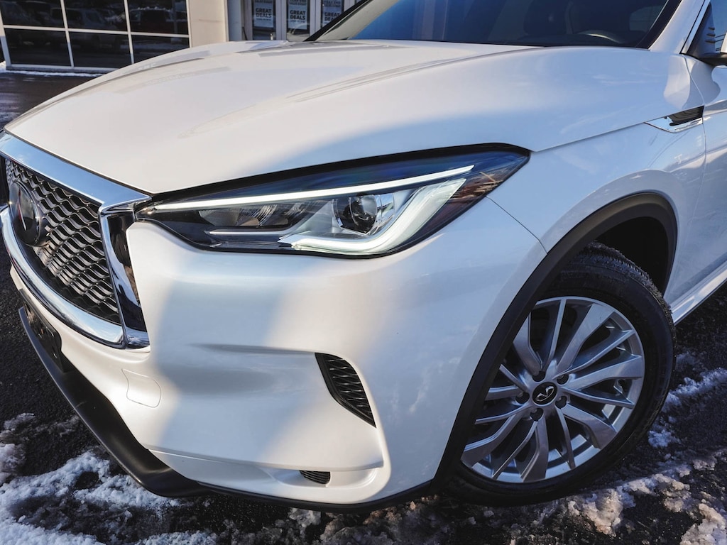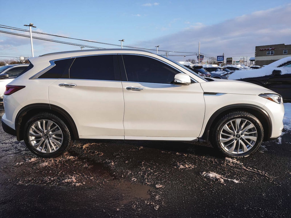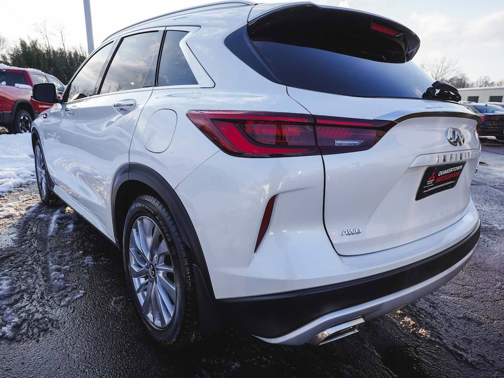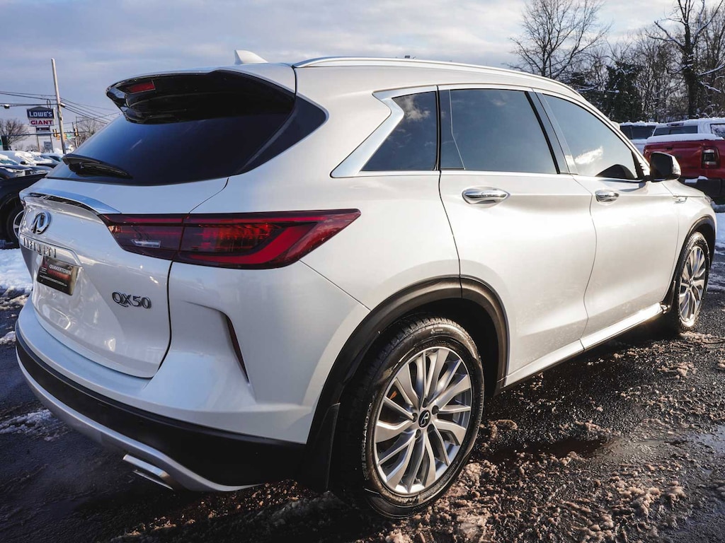 2023 INFINITI QX50 LUXE ONE OWNER, BLUE TOOTH, NEW PA STATE INSPECTION, FULLY RECONDITIONED, NAVIGATION, ALLOY WHEELS, PANORAMIC SUNROOF, LEATHER, BACK UP CAMERA, QX50 LUXE, 4D Sport Utility, I4, CVT, AWD, Radiant White, Graphite w/Leather-Appointed Seat Trim, 4-Wheel Disc Brakes, ABS brakes, Aluminum Interior Accents, AM/FM radio: SiriusXM, Auto High-beam Headlights, Auto-dimming Rear-View mirror, Automatic temperature control, Bose 12-Speaker Premium Audio, Brake assist, Cruise control, Dual front impact airbags, Dual front side impact airbags, Electronic Stability Control, Exterior Parking Camera Rear, Four wheel independent suspension, Front dual zone A/C, Fully automatic headlights, Garage door transmitter: HomeLink, Heated door mirrors, Heated Front Bucket Seats, Illuminated entry, Illuminated Kick Plates, Knee airbag, Leather Shift Knob, Leather steering wheel, Leather-Appointed Seat Trim, Low tire pressure warning, Memory seat, Occupant sensing airbag, Overhead airbag, Panic alarm, Power door mirrors, Power driver seat, Power Liftgate, Power passenger seat, Radio: HD Audio System, Rear Parking Sensors, Rear side impact airbag, Rear window defroster, Rear window wiper, Remote keyless entry, Security system, Telescoping steering wheel, Tilt steering wheel, Traction control, Turn signal indicator mirrors, Wheels: 19" Silver Painted Aluminum Alloy. 22/28 City/Highway MPG
