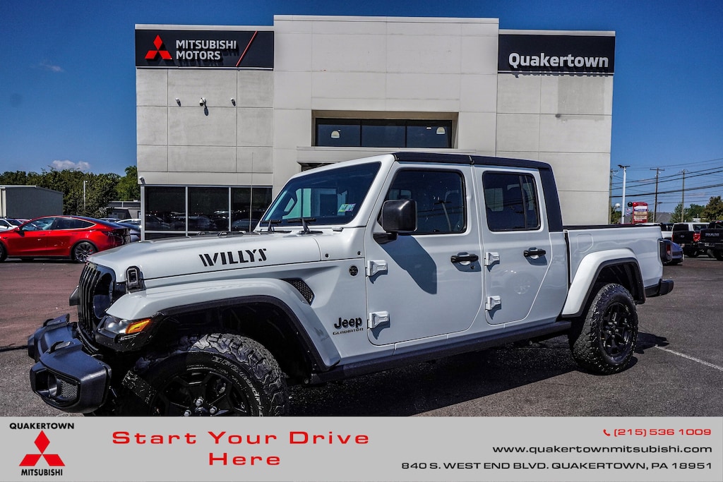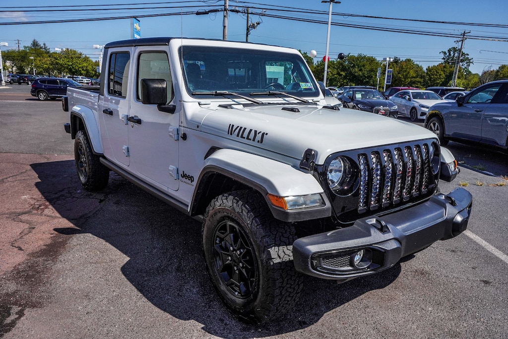 2021 Jeep Gladiator Willys ONE OWNER, BLUE TOOTH, NEW PA STATE INSPECTION, FULLY RECONDITIONED, NAVIGATION, ALLOY WHEELS, BACK UP CAMERA, Gladiator Willys, 4D Crew Cab, 3.6L V6 24V VVT, 8-Speed Automatic, 4WD, Bright White Clearcoat, Black w/Cloth Bucket Seats, 110 mph Vehicle Max Speed Calibration, 4-Wheel Disc Brakes, 7.0" Touch Screen Display, 8 Speakers, ABS brakes, Air Conditioning w/Auto Temperature Control, AM/FM radio, Anti-Lock 4-Wheel Disc Heavy Duty Brakes, Anti-Spin Differential Rear Axle, Apple CarPlay, Automatic Headlamps, Black 3-Piece Hard Top, Black Grille, Black Trail Rated Badge, Body Color Fender Flares (2-Piece), Brake assist, Cluster 7.0" TFT Color Display, Convenience Group, Cruise control, Daytime Running Lamp System, Dual front impact airbags, Dual front side impact airbags, Electronic Stability Control, Front Bucket Seats, Front fog lights, Front Heavy Duty Red Accent Shock Absorbers, Google Android Auto, GPS Antenna Input, GPS Navigation, Integrated Center Stack Radio, Integrated roll-over protection, Integrated Voice Command w/Bluetooth, Leather Wrapped Steering Wheel, Low tire pressure warning, MOPAR Spray In Bedliner, Occupant sensing airbag, ParkView Rear Back-Up Camera, Power Heated Mirrors, Power Tailgate Lock, Protection Sill Rails, Quick Order Package 24W Willys, Radio: Uconnect 4 w/7" Display, Rear Heavy Duty Red Accent Shock Absorbers, Rear Window Defroster, Remote Keyless Entry, Security Alarm, Selec-Speed Control, SiriusXM Radio Service, SiriusXM Satellite Radio, Speed Sensitive Power Locks, Technology Group, Telescoping steering wheel, Tilt steering wheel, Traction control, Universal Garage Door Opener, USB Host Flip, Wheels: 17" x 7.5" Black Aluminum w/Gray Pad, Willys, Willys Hood Decal.
