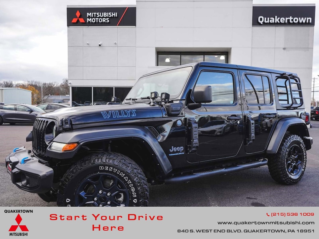 2023 Jeep Wrangler Willys 4xe ONE OWNER, BLUE TOOTH, NEW PA STATE INSPECTION, FULLY RECONDITIONED, NAVIGATION, ALLOY WHEELS, BACK UP CAMERA, Wrangler Willys 4xe, 4D Sport Utility, 2.0L I4 DOHC, 8-Speed Automatic, 4WD, Black Clearcoat, Black w/Cloth Low-Back Bucket Seats, 4-Wheel Disc Brakes, 4G LTE Wi-Fi Hot Spot, 4xe 4-Wheel Drive Swing Gate Decal, 8.4" Radio Group, 8.4" Touchscreen Display, 9 Speakers, 97 MPH Vehicle Max Speed Calibration, ABS brakes, AM/FM radio: SiriusXM, Anti-Spin Differential Rear Axle, Apple CarPlay/Android Auto, Auto-Dimming Rear-View Mirror, Automatic temperature control, Black 3-Piece Hard Top, Black Grille, Brake assist, Cloth Low-Back Bucket Seats, Convenience Group, Cruise control, Dual front impact airbags, Dual front side impact airbags, Electronic Stability Control, Front dual zone A/C, Front fog lights, Front LED Fog Lamps, Fully automatic headlights, GPS Antenna Input, GPS Navigation, HD Radio, Heated door mirrors, Illuminated entry, Integrated Center Stack Radio, Integrated roll-over protection, Integrated Voice Command w/Bluetooth, LED Headlamp & Fog Lamp Group, LED Premium Reflector Headlamps, Low tire pressure warning, Molded-In-Color Fender Flares (2-Piece), Normal Duty Suspension, Occupant sensing airbag, Panic alarm, ParkView Rear Back-Up Camera, Power door mirrors, Quick Order Package 29W Willys, Radio: Uconnect 4C Nav w/8.4" Display, Rear Window Defroster, Rear Window Wiper/Washer, Remote keyless entry, Security system, Telescoping steering wheel, Tilt steering wheel, Traction control, Universal Garage Door Opener, USB Host Flip, Wheels: 17" x 7.5" Black Aluminum, Willys, Willys 4xe Hood Decal. Odometer is 9108 miles below market average!